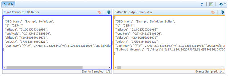 You can perform GeoEvent sampling on two routes at the same time. Sampling two routes can be useful to compare and validate changes on related real-time data. For example, a GeoEvent emitted by a Buffer Creator Processor can be expected to have a different geometry (polygon) from its original source geometry (point). By sampling GeoEvents from the routes going to and from the processor, you can confirm that GeoEvents are not only received by the Buffer Creator Processor, they are buffered by the processor as well.